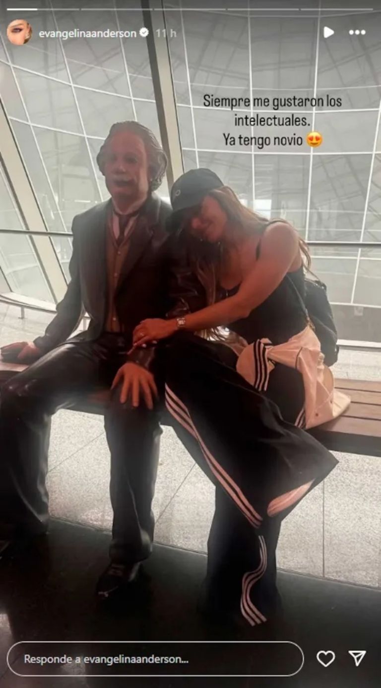 Desde el aeropuerto de Frankfurt, en Alemania, y antes de viajar a Milán para asistir a la Semana de la Moda, la modelo subió una foto a sus historias en la que posa junto a una estatua de Albert Einstein.