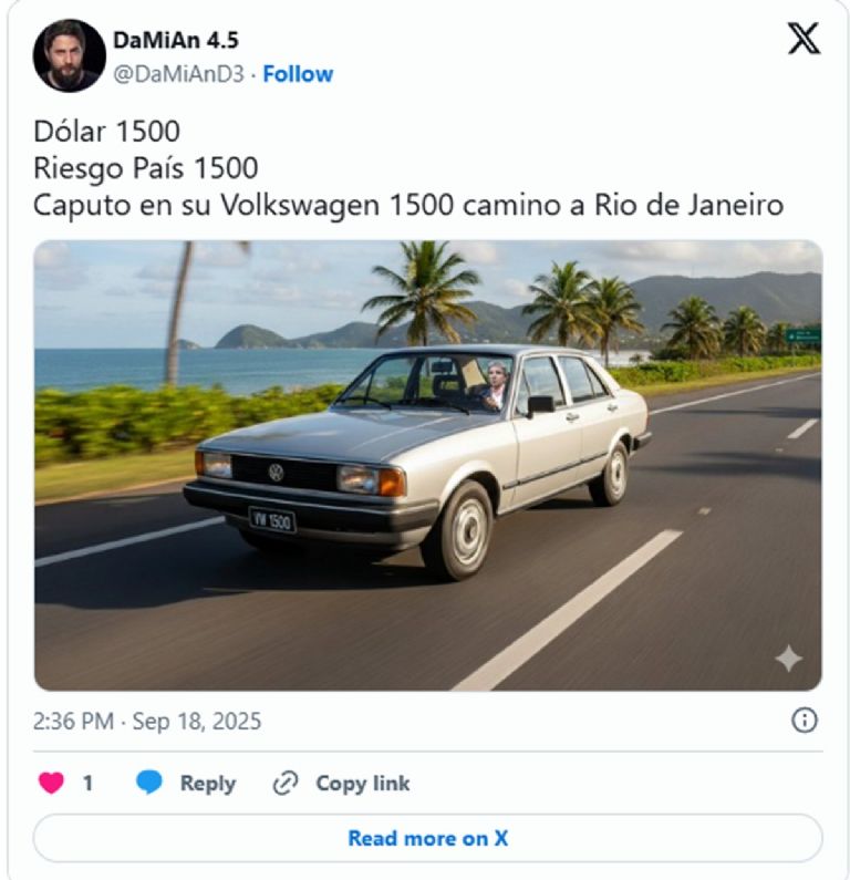 Como es costumbre, los argentinos muestran su catarsis a través de cómicos memes y, esta vez, el chiste más arengado fue el que unió todas las variables económicas del día en un solo concepto automovilístico: "Dólar 1500. Riesgo País 1500. Caputo en su Volkswagen 1500 camino a Rio de Janeiro", en una clara referencia al clásico auto y a una supuesta huida del ministro.