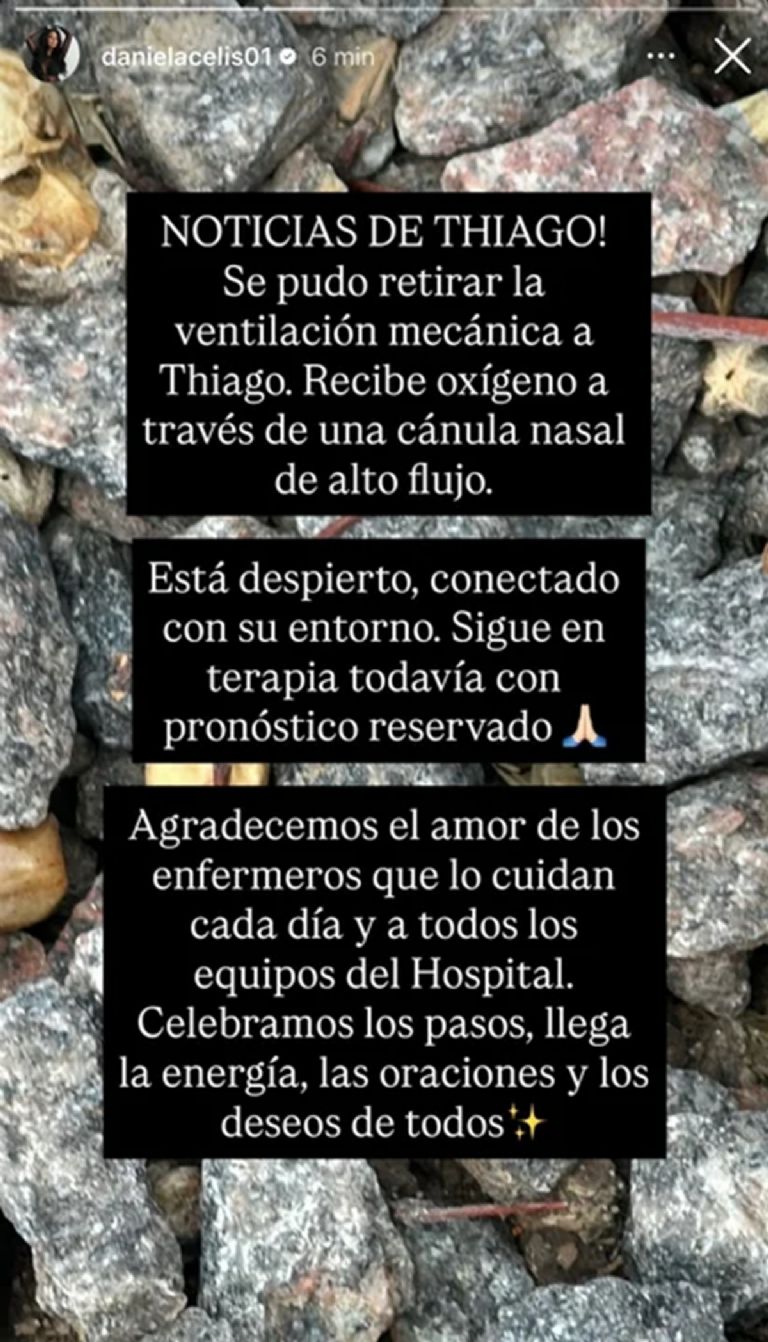 “Noticias de Thiago. Se pudo retirar la ventilación mecánica a Thiago. Recibe oxígeno a través de una cánula nasal de alto flujo. Está despierto, conectado con su entorno. Sigue en terapia todavía con pronóstico reservado”, dijo la influencer.