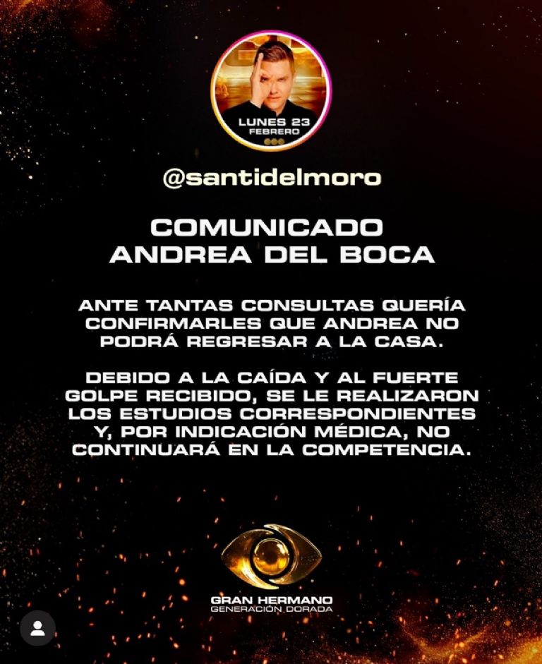 Andrea del Boca sufrió una dura caída y tuvo que abandonar la casa de Gran Hermano