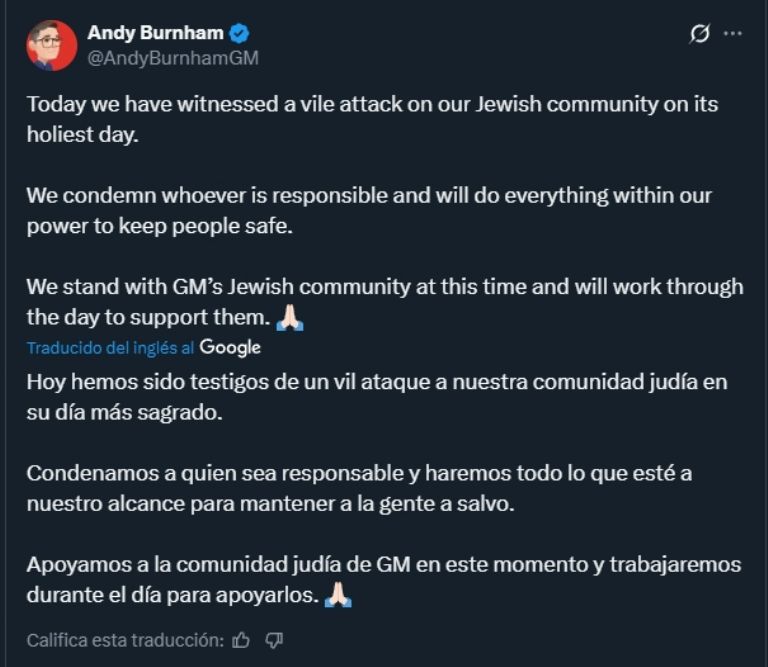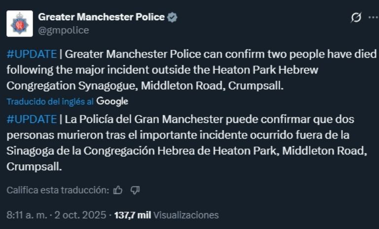 La Policía indicó en un comunicado que los agentes acudieron a las 9:31 hora local a la Sinagoga de la Congregación Hebrea de Heaton Park, ubicada en Middleton Road, Crumpsall, después de que un ciudadano denunciara haber visto un coche atropellando a peatones y a un hombre apuñalado.