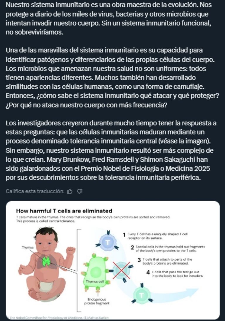 El Premio Nobel de Medicina o Fisiología de 2025 fue otorgado este lunes a Mary E. Brunkow, Fred Ramsdell y Shimon Sakaguchi "por sus descubrimientos sobre la tolerancia inmune periférica".