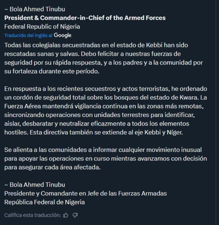 “Me alivia que las 24 niñas hayan sido localizadas”, dijo Tinubu en un comunicado difundido el martes por la noche, después de que las autoridades locales anunciaran que las estudiantes habían sido liberados ilesas.