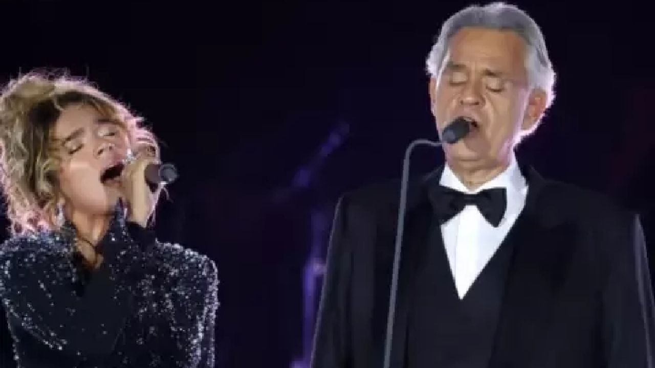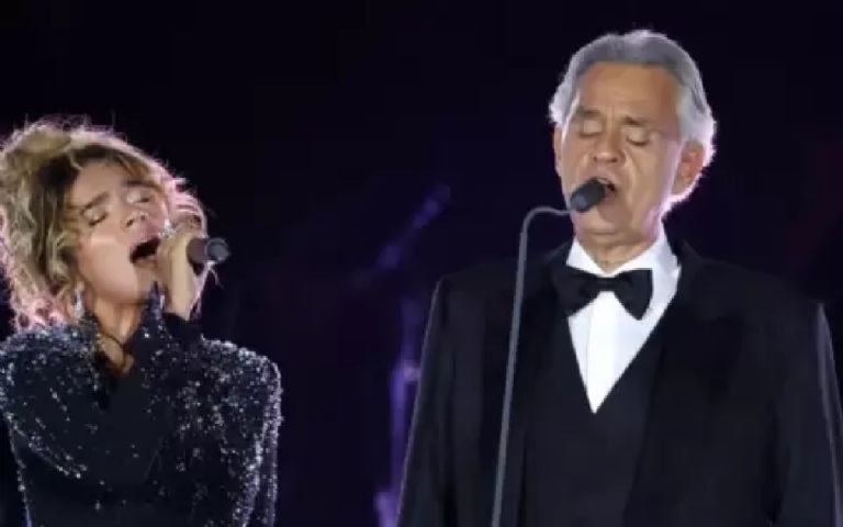 Lo cierto es que, consciente de las controversias, acorde a la “location”, la cantante colombiana -una de las más aplaudidas por fans con banderas del país latinoamericano-, no apareció ligera de ropas, sino con un vestido negro, atildado, sin escotes y mangas largas. Y se lució cantando en dúo con Bocelli “Vivo per lei”, famoso himno a la música del tenor italiano.