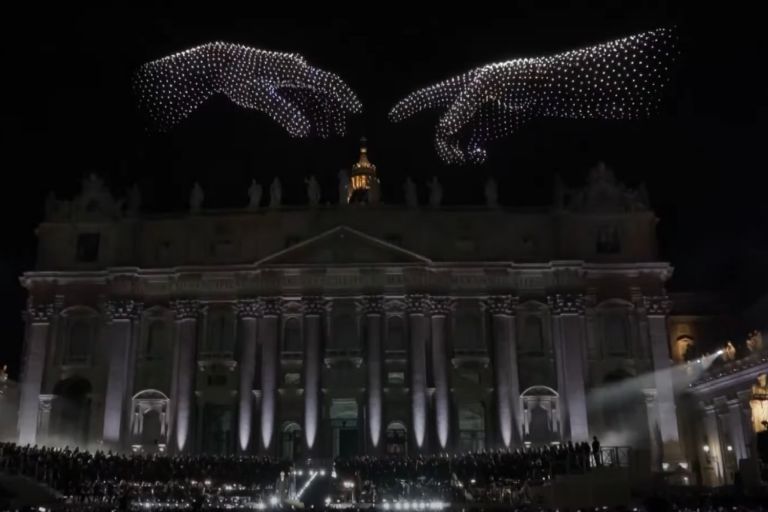 Codirigido por Andrea Bocelli y Pharrell Williams, el evento, que también quiso celebrar el Jubileo por el Año Santo del 2025 en curso, arrancó con una sorpresa: un emocionante homenaje al papa Francisco, cuyo rostro formado por miles de drones iluminados apareció de repente sobre el contorno de la Basílica de San Pedro, mientras Bocelli y Teddy Swims (Lose Control) entonaban “Amazing Grace”.