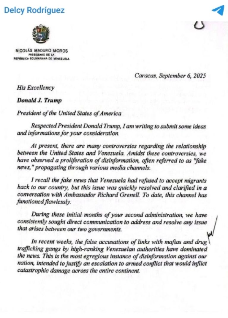 La misiva fue publicada por la vicepresidenta venezolana, Delcy Rodríguez, en su cuenta de la red social Telegram, al argumentar que decidió su divulgación ante las filtraciones de medios estadounidenses.
