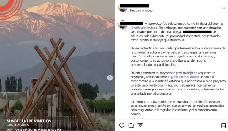 Una arquitecta asegura que le robaron la propiedad intelectual del proyecto "Sunset Entre Viñedos" de Bardo en la Bodega. En su perfil acusó a otra colega de haberse adjudicado la autoría del proyecto y afirmó que iniciará acciones legales. "Eso no salió de acuerdo a lo planeado", bromearon los cuyis.