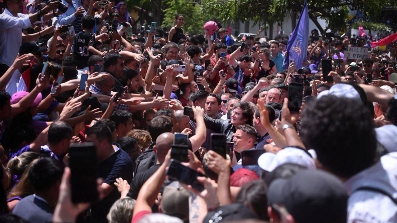 La llegada del mandatario ocurrió minutos después del mediodía, dos horas después del horario previsto y caminó entre los militantes libertarios de Chaco.