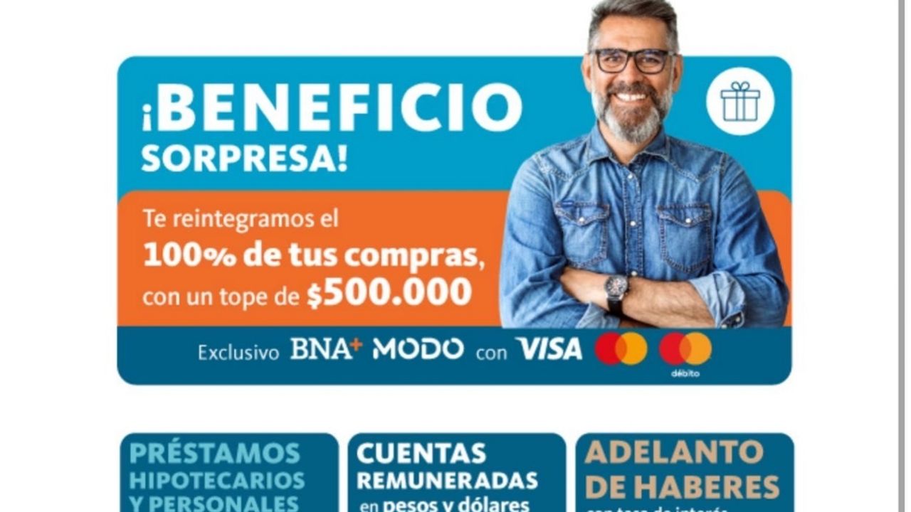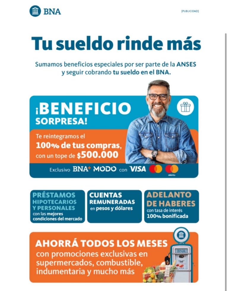 Según se detalla en la comunicación oficial del Nación, para acceder al "Beneficio Sorpresa" los empleados de Anses deberán cumplir dos condiciones fundamentales: percibir su sueldo en una cuenta del Banco Nación y realizar sus compras a través de la aplicación BNA+ MODO utilizando las tarjetas de débito o crédito Visa asociadas.