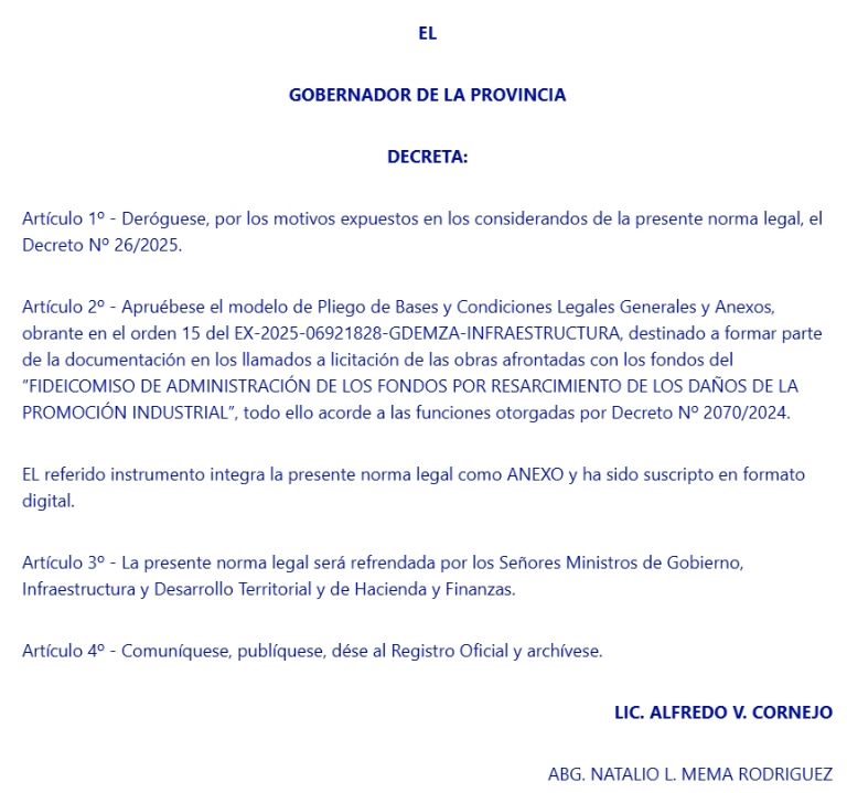 El gobernador Alfredo Cornejo derogó el decreto 26 que determinaba modelo de Pliego de Bases y Condiciones Legales Generales. El nuevo texto modifica la metodología para la adjudicación.