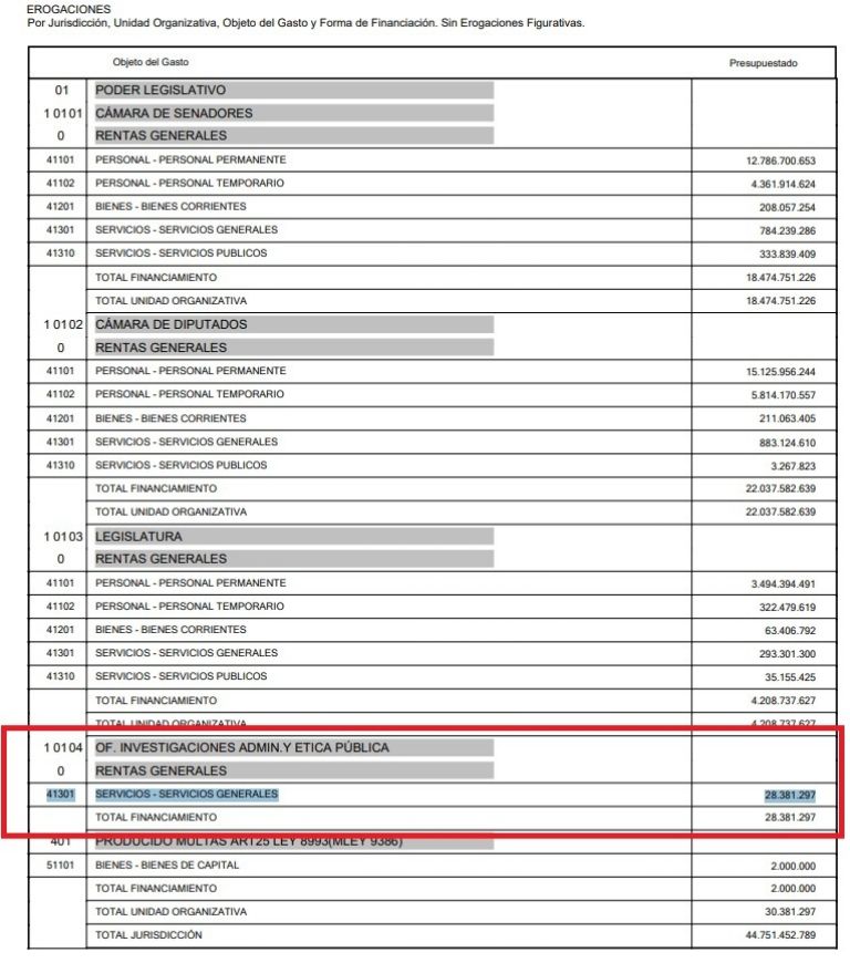 Según explicaron a El Medio desde la Oficina de Ética Pública, el dinero no incluye partidas para sueldos ya que todos los empleados (13 en total) están designados en comisión desde otras dependencias estatales. En cuanto al auditor General, Gabriel Balsells Miró, su salario se transfiere directamente a la Cámara de Senadores. El presupuesto operativo de la oficina representa un tercio de lo que gana al año el auditor general.