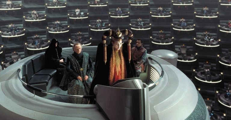 En Star Wars episodio III, Sheev Palpatine disuelve el Senado Galáctico al proclamarse emperador.