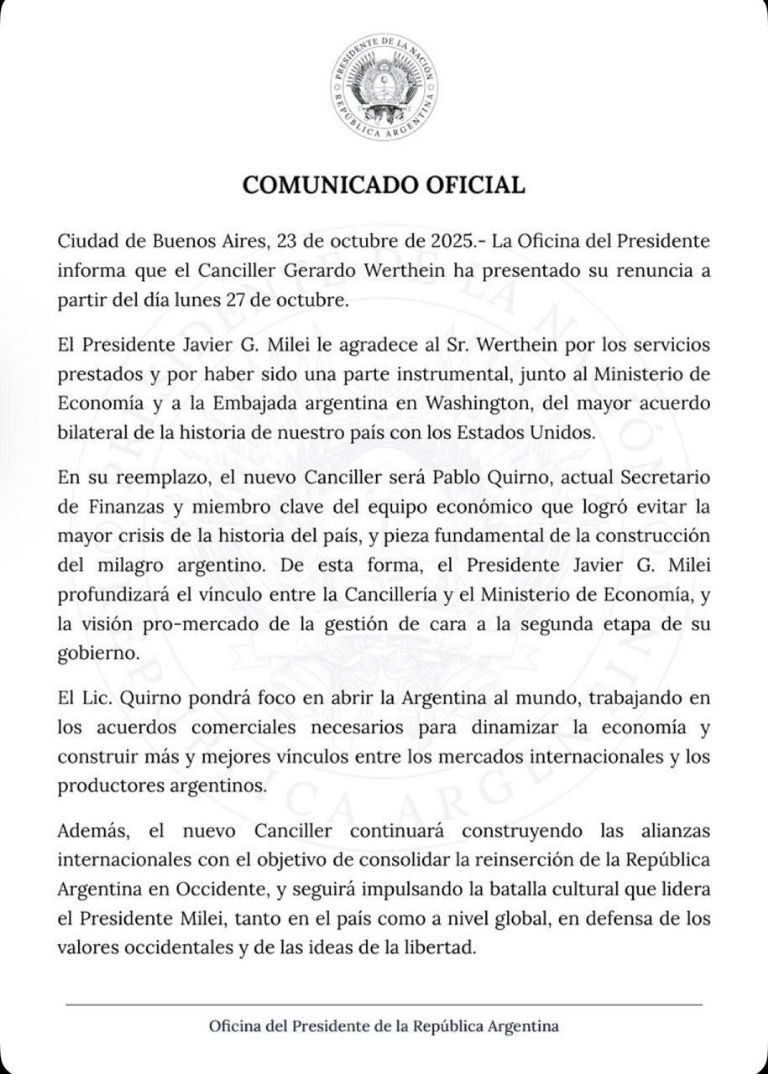 La designación fue confirmada por la Oficina del Presidente a través de X, destacando que el enroque busca "profundizar el vínculo entre la Cancillería y el Ministerio de Economía, y la visión pro-mercado de la gestión de cara a la segunda etapa de su gobierno". El comunicado oficial agradeció a Werthein por su labor, especialmente por ser "instrumental" en el "mayor acuerdo bilateral de la historia de nuestro país con los Estados Unidos".