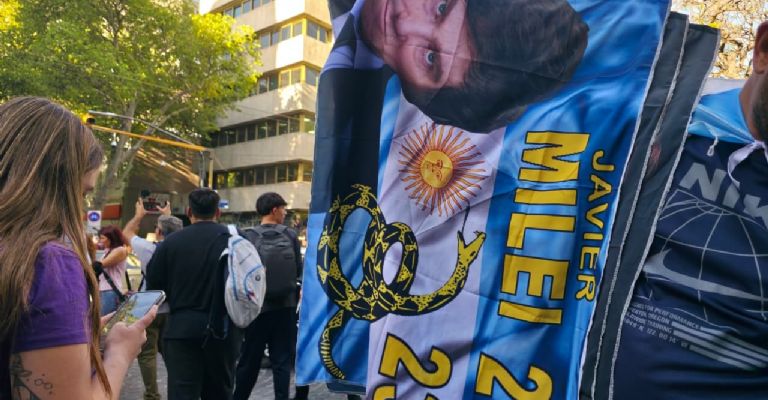 Armados con banderas de color violeta, gorras y banderas, los seguidores del Presidente cantaban, entre otras cosas, “Cristina tobillera”. Como contraparte, un grupo de jubilados se manifestó en contra del mandatario. "Fuera Milei. Hambreador, represor y estafador", expresaba uno de los carteles.