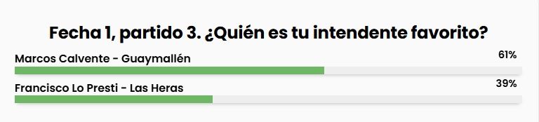 Con el duelo entre Marcos Calvente y Francisco Lo Presti se cerró la primera fecha del torneo que enfrenta a los intendentes del Gran Mendoza. Así quedó la tabla de posiciones.