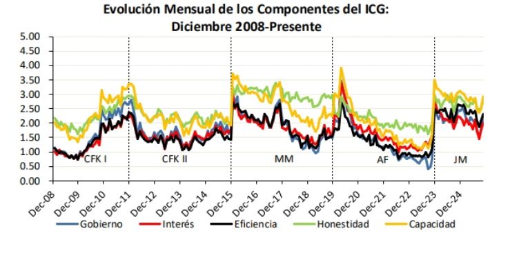 El informe puntualizó que “este mes se observa un cambio en la jerarquía relativa de los subíndices: el de capacidad logra superar al de honestidad, aunque ambos se mantienen como los mejor valorados; eficiencia continúa ocupando el tercer lugar y gobierno pasa a ubicarse por encima de interés, que sigue rezagado frente al resto”.