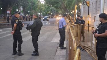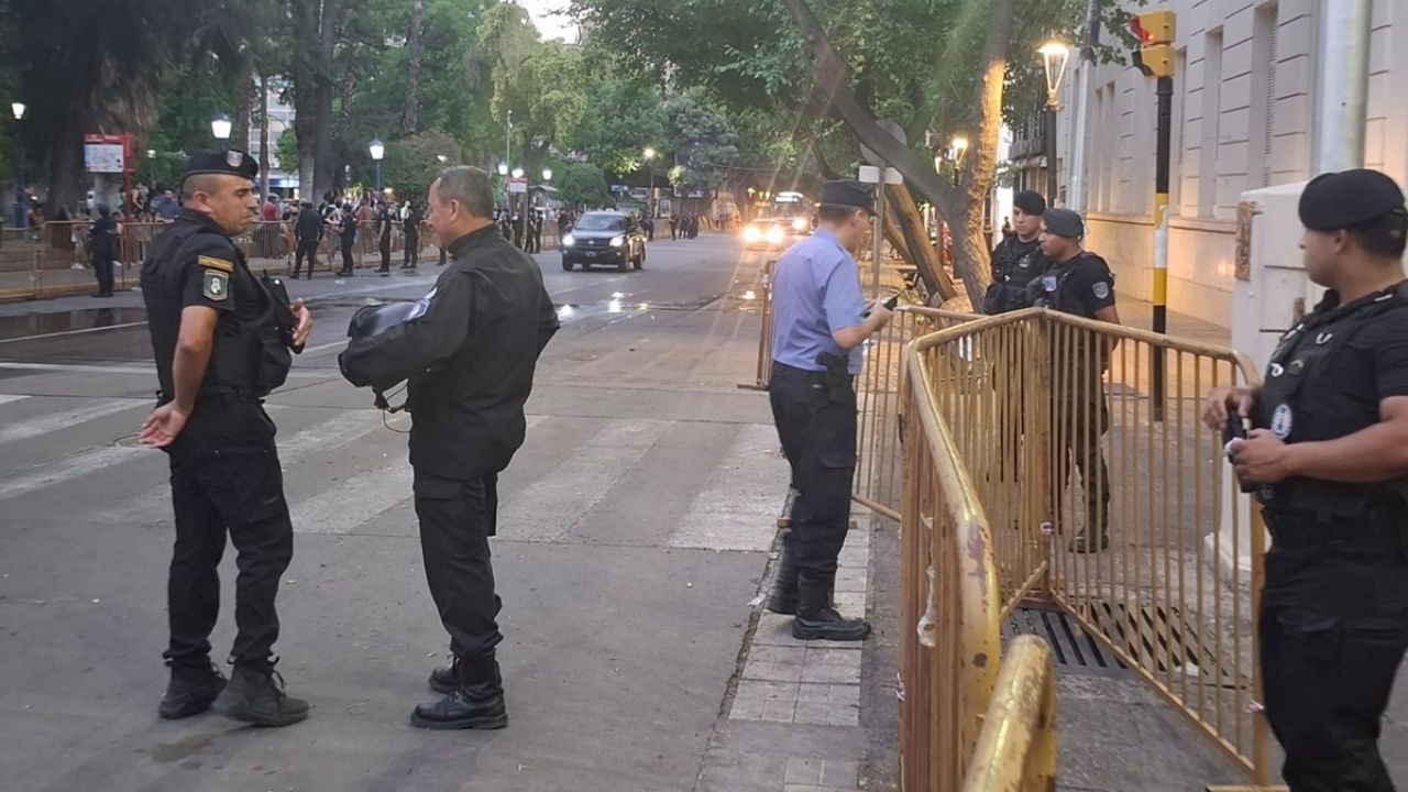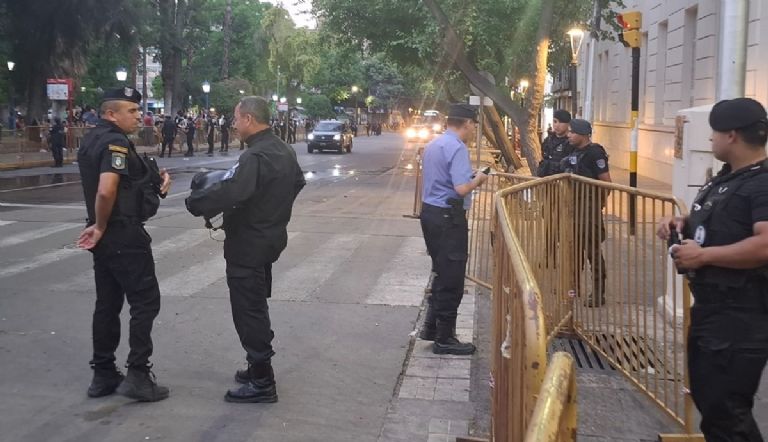 Varios policías custodiaban la Legislatura tanto por calle Patricias Mendocinas, como por Peatonal Sarmiento, fueron asistiendo a los diputados mientras también trataban de estar cerca de los pocos manifestantes que quedaban repartidos por esas calles.