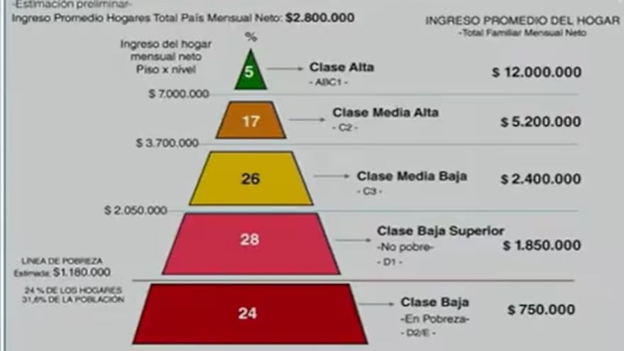 Se trata de una pirámide social que establece distintos segmentos, en función del nivel de ingresos del hogar. El estrato más alto, que concentra al 5%, estipula disponer de al menos $7 millones mensuales y registra un promedio de $12 millones.