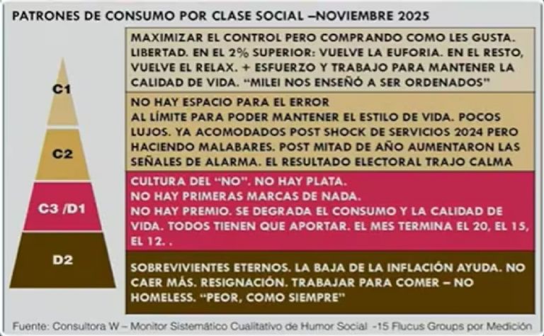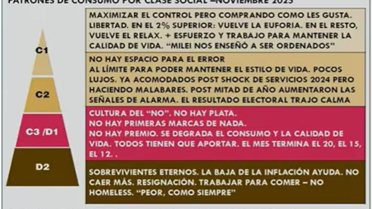 La “Clase media baja” y la “Clase baja superior, no pobre” experimentan “la cultura del ‘no’”. En este escalafón se lee la frase “no hay plata”, según el trabajo de la consultora W.