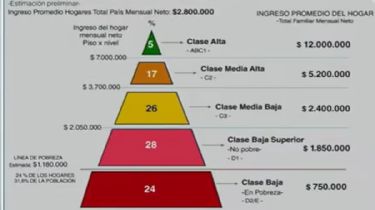El piso de la “Clase media baja” es de $2,05 millones, con un promedio mensual de $2,4 millones. En este escalafón se encuentra el 26% de la pirámide.