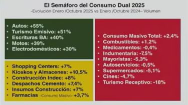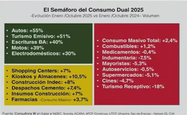 Entonces, en esta realidad hay sectores productivos ganadores y perdedores. De allí surge la idea de un “semáforo de consumo”, donde autos y viajes al exterior encabezan con repuntes superiores al 50% entre enero y octubre de 2025 comparado con el mismo período del año anterior.