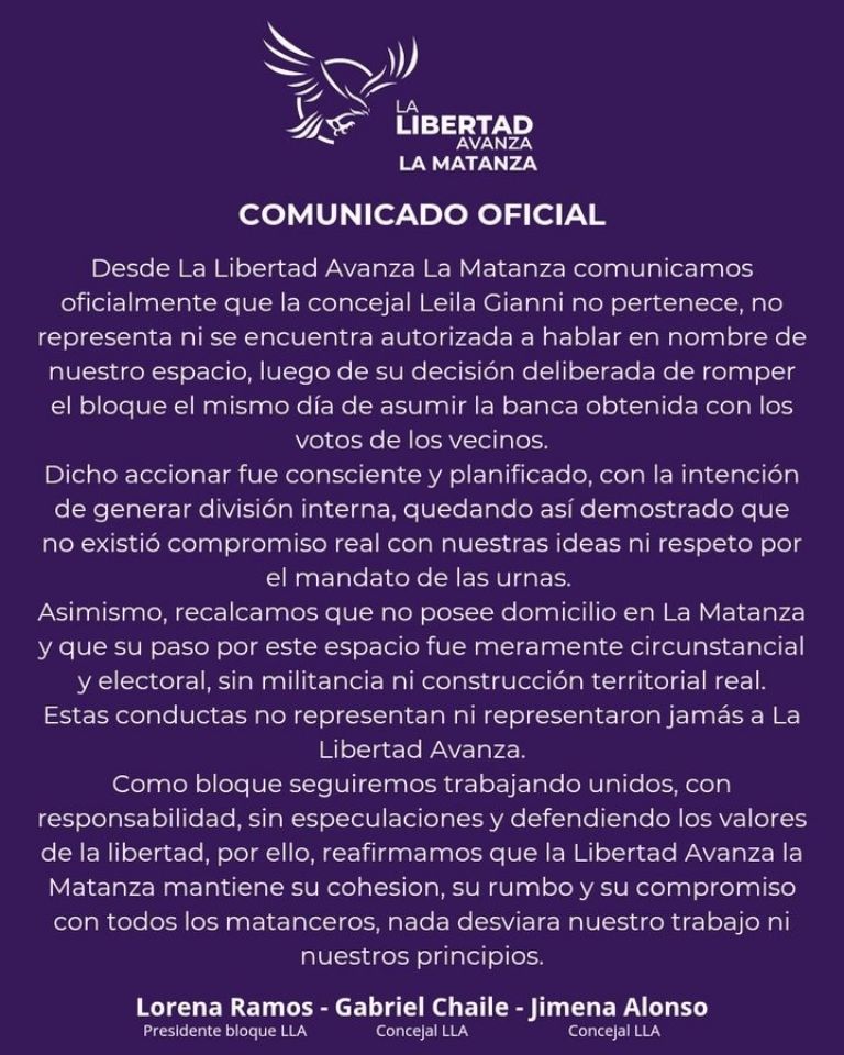La Libertad Avanza(LLA) de La Matanza emitió un comunicado en el que afirmó que la concejal Leila Gianni “no pertenece, no representa ni se encuentra autorizada” a hablar en nombre del espacio.