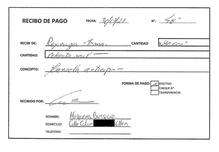 Burgoa, según consta en el recibo, es quién firmó cuando Irma Reynaga pagó los 80 mil pesos en efectivo el 30 de julio del 2021. Incluso, su firma aparece en algunos de los recibos de las cuotas mensuales abonadas por la denunciante.