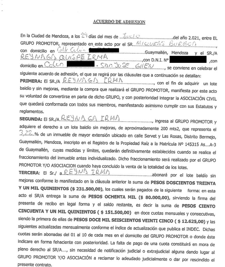 Lo llamativo es que adjunta a la nota un acuerdo de adhesión firmado el 29 de julio del año 2021 y que está firmado por el concejal Miqueas Burgoa. Allí, se deja constancia de que Reynaga ingresa al "Grupo Promotor" para hacerse de un lote de 200 m2 "que representa el 3,22% de un inmueble de mayor extensión ubicado en la calle Servet y Las Rosas, distrito Bermejo.