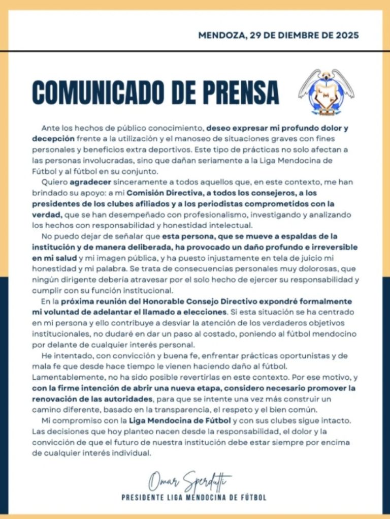 Esta semana el presidente de la Liga Mendocina de Fútbol, Omar Sperdutti, anunció que adelantará las elecciones de autoridades. Lo hizo luego de que el gobierno de Mendoza amenazara directamente con intervenir la institución en medio de un claro enfrentamiento entre las autoridades del fútbol y la diputada radical Giuliana Díaz. Hasta la semana pasada el conflicto parecía circunscribirse a la conducción de la Liga y la presidenta de la comisión de Fútbol Femenino, pero ahora ha quedado claro que detrás de Díaz está agazapado el propio gobernador Alfredo Cornejo. Y Sperdutti -que no es nuevo en el tema- lo interpretó con celeridad.