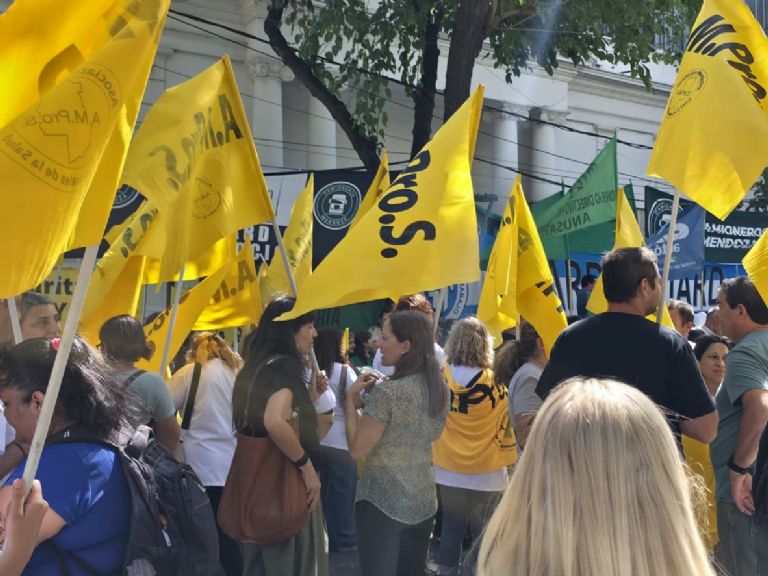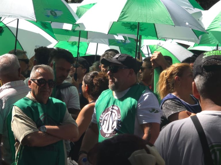 Los representantes y afiliados comenzaron a reunirse temprano en la mañana y sumados al paro nacional. En la puerta de la Casa de las Leyes había banderas de Ampros, ATE, CGT y otros sindicatos.