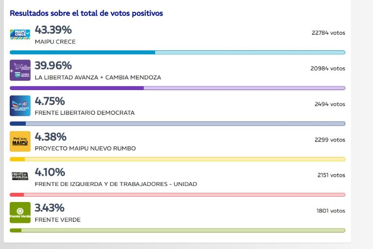 Después de muchas encuestas que vaticinaban escenarios contradictorios, finalmente este domingo los maipucinos le pusieron fin a las especulaciones y en una contienda ajustada se impuso la lista de los candidatos del intendente Matías Stevanato. En concreto, con el 43% de los votos el peronismo fue el espacio más votado seguido por el frente La Libertad Avanza + Cambia Mendoza que se quedó con el 39%.