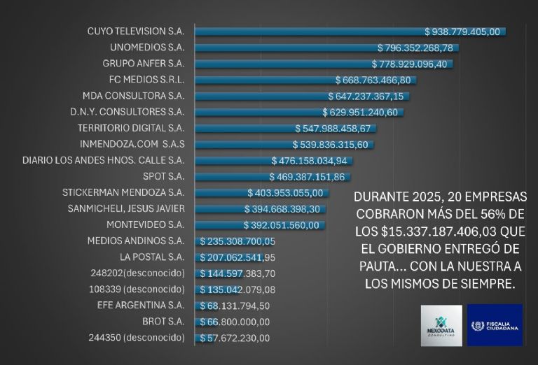 En los últimos cuatro meses del 2025 el gobierno de Alfredo Cornejo destinó más de 7 mil millones de pesos apauta oficial. En total, el año pasado se desembolsaron más de 15 mil millones de pesos en ese concepto sin que exista justificación sobre el criterio con el que se contrata a proveedores o el servicio que le prestan al Estado. En la Suprema Corte existe una Acción Procesal Administrativa que procura transparentar esos procesos conociendo en detalle los contratos suscriptos en 2024 y 2025 con las consultoras DNY y MDA, dos de las principales benefactoras de la pauta oficial. Estaba previsto que esta semana se presentaran a audiencia los responsables del área de comunicación del gobierno, pero los jueces Mario Adaro, José Valerio y Teresa Day todavía no resuelven si es pertinente realizar esa medida.