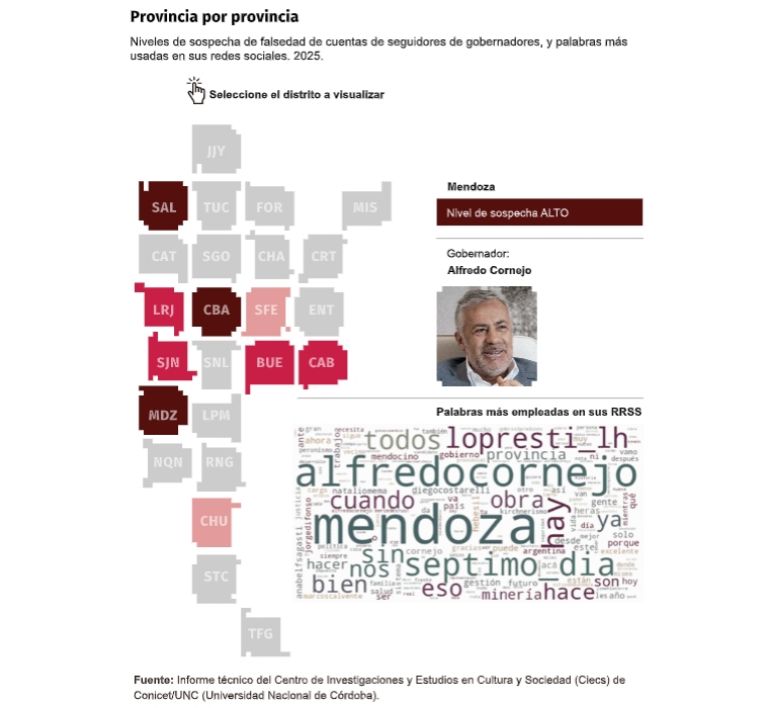 El Centro de Investigaciones y Estudios en Cultura y Sociedad, a demanda de la red El Ruido, realizó un informe sobre la actividad de cuentas sospechosas que operan en el país apoyando la gestión de los distintos gobernadores. De los resultados se desprende que Mendoza es una de las provincias con más altos niveles de actividad sospechosa de perfiles truchos sin que existan datos de cómo se financian esos "Troll Center". De esta manera, se ratifica lo que El Medio había dado a conocer en mayo del 2025, cuando expuso la actividad de 19 cuentas falsas que atacaban a dirigentes de la oposición y posteaban comentarios positivos respecto a la gestión de Alfredo Cornejo.