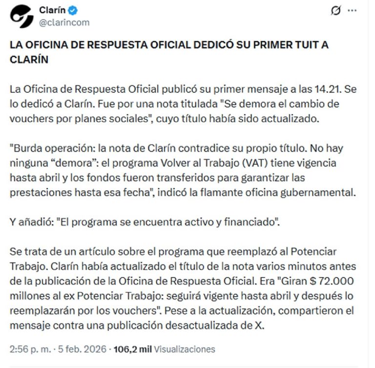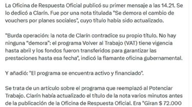 Pero Clarín también dio su versión. Por X informó que la Oficina de Respuesta Oficial publicó su primer mensaje a las 14.21. Se lo dedicó a Clarín. Fue por una nota titulada "Se demora el cambio de vouchers por planes sociales", cuyo título había sido actualizado.