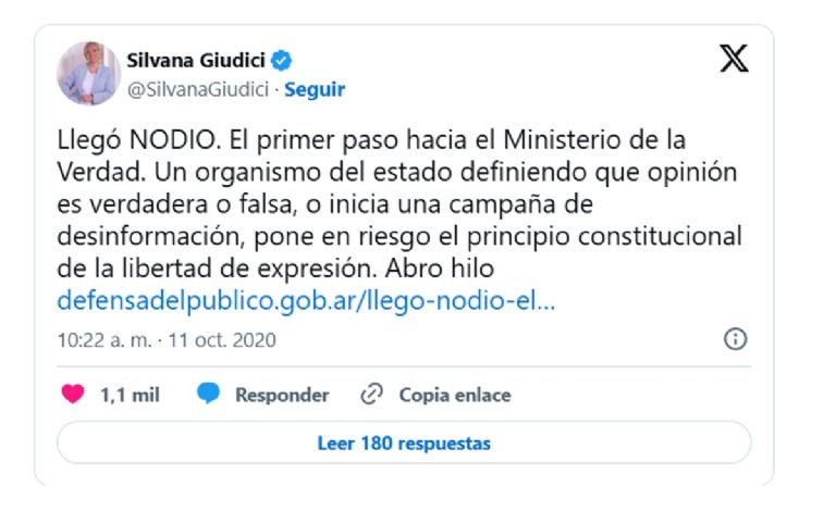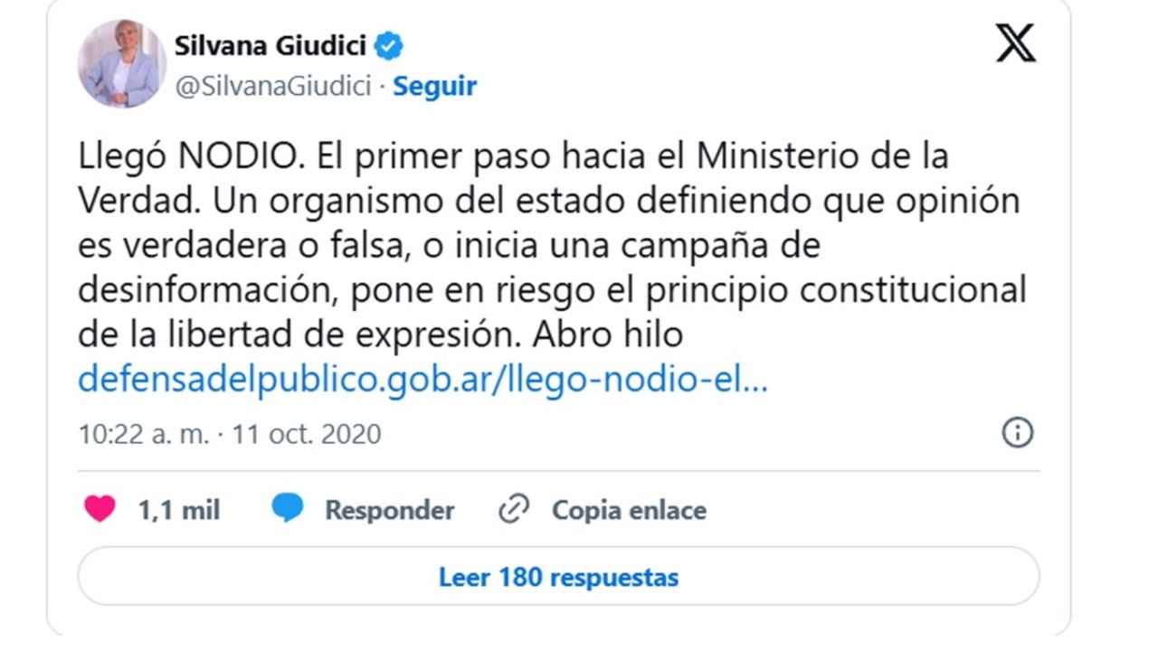 Una de las más críticas de Nodio fue Giudici, conversa al mileísmo. La Fundación LED (Libertad de Expresión + Democracia) y extitular del Ente Nacional de Comunicaciones (Enacom) remarcó que era "peligroso para la libertad de prensa y expresión que el Estado asuma el rol de verificador de las noticias".