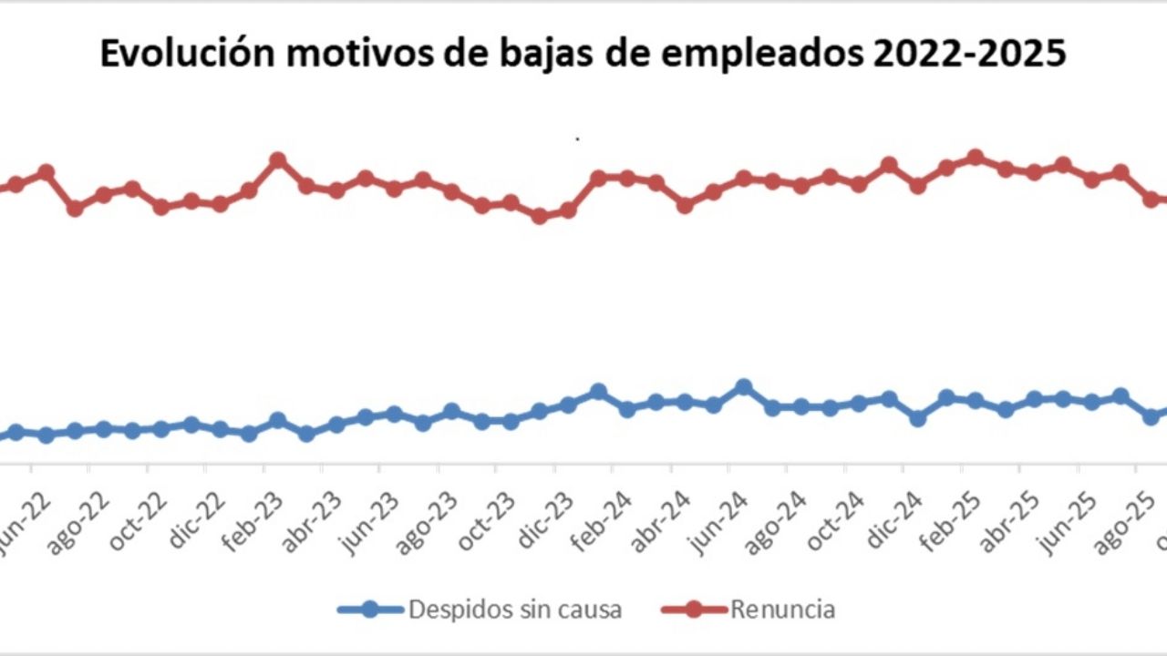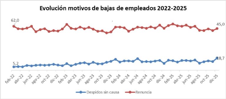 Una de las hipótesis fundamentales de este estudio es que, a partir de la reforma laboral, los trabajadores van a ceder terreno. Pero como veremos, en realidad, habría que decir, a seguir cediendo. Sucede que dentro de los empleados formales, los motivos de las bajas también exponen un cambio de perfil del modelo. Hace cuatro años, los motivos de bajas de empleados por renuncias, es decir, por decisión del empleado, representaba el 62%. El año 2025, antes de la reforma, ese motivo cedió y hoy representa al 45%. Mientras, por el otro lado, comparando el mismo período, los despidos sin causa crecieron poco más de 13%.