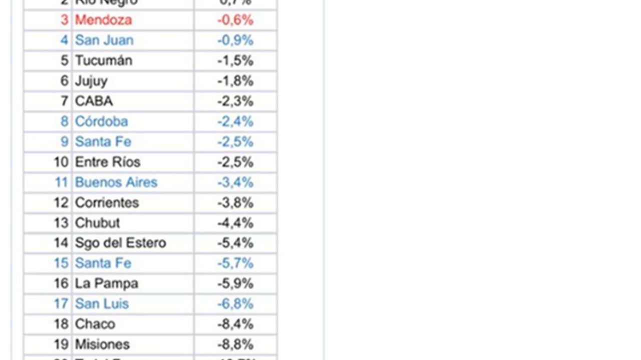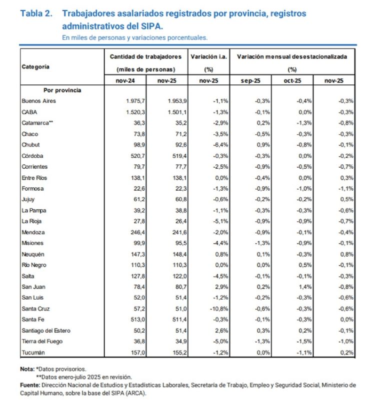Muestra que entre noviembre del 2023 y el mismo mes del 2025, Mendoza tuvo una leve caída del empleo 0,6%. El período abarca la gestión de Javier Milei. Lo cierto es que en esos dos años la provincia perdió 1.300 puestos de trabajo formales.