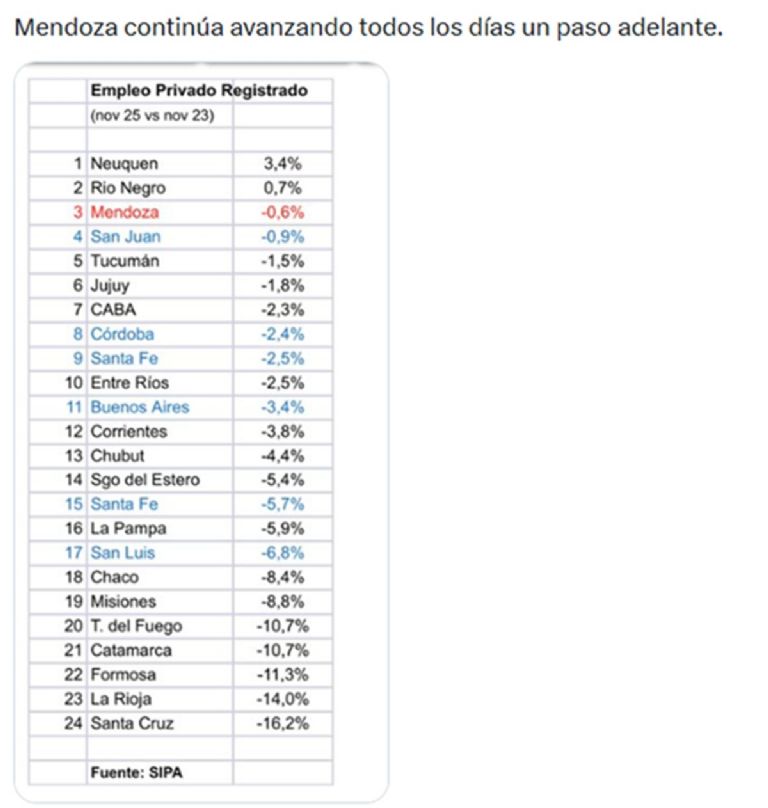La provincia perdió 5.000 puestos de trabajos formales. Obviamente no hay nada que festejar ni celebrar, pero como Cornejo quiere que Milei lo elija como candidato a vicepresidente, ahí anda; manipulando datos nuevamente.