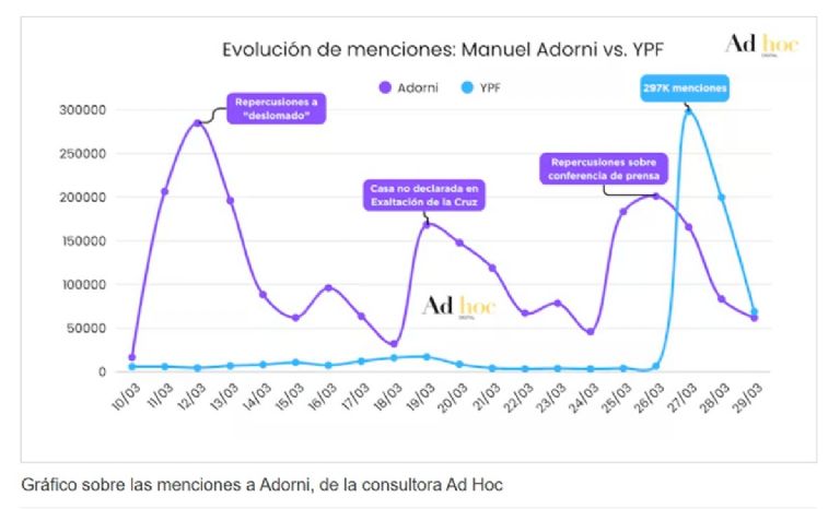 Para explicar la magnitud de la repercusión del caso Adorni, apuntaron a que “el caso YPF (en relación al fallo de la justicia estadounidense en favor de Argentina) generó el último viernes 297.000 menciones”. A lo que agregan que el tema YPF “tuvo un pico alto el viernes y muestra una tendencia a la baja, a diferencia del caso Adorni”.