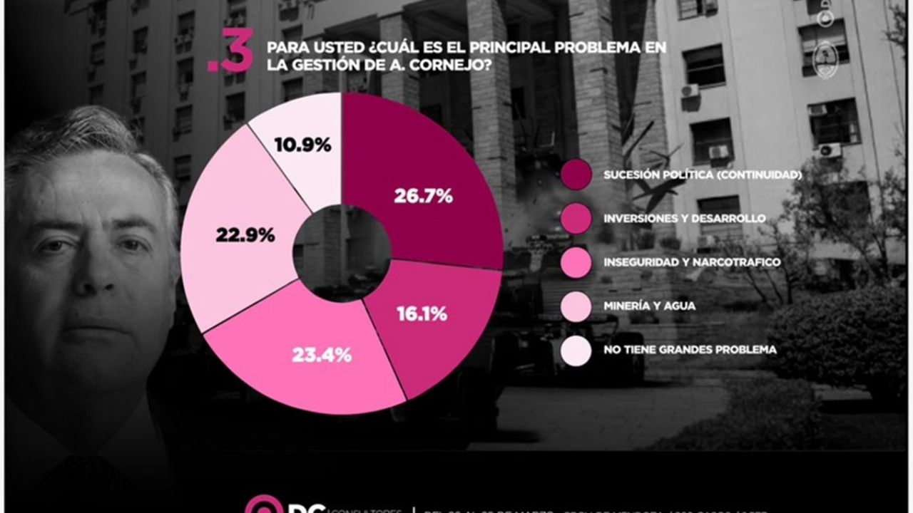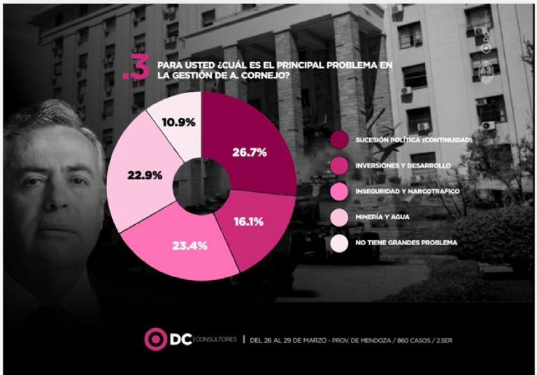 Una encuesta realizada por DC Consultores entre casi 900 mendocinos entre el 26 y 29 de marzo indicó que el principal problema que tiene la gestión Cornejo es la falta de un sucesor político con el 26,7%. Hasta ahí nada grave, el gran problema es que en segundo lugar con el 23,4% aparece la inseguridad y el narcotráfico y luego. Después inversiones y desarrollo con el 16,1% y agua y minería con el 10,9% de las respuestas de los consultados.