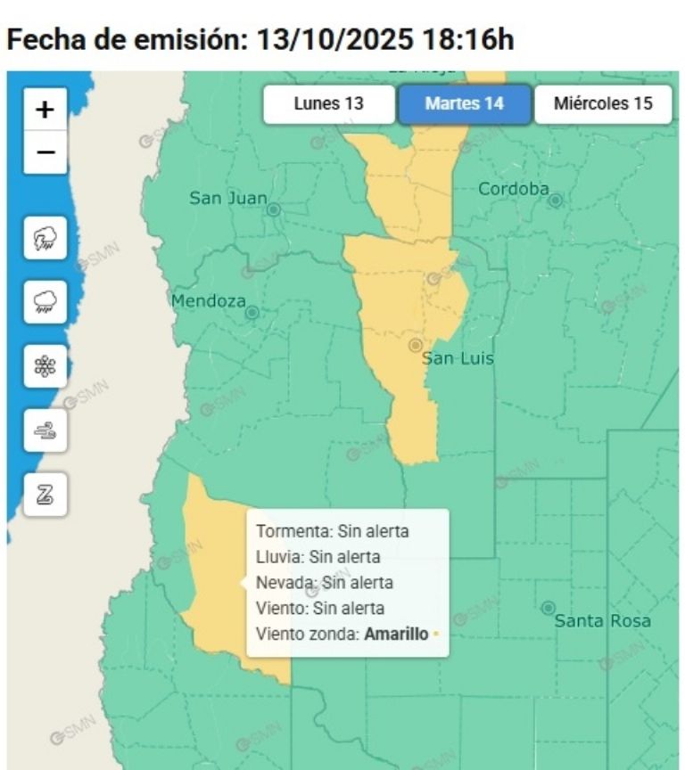 En tanto, el Servicio Meteorológico Nacional lanzó una alerta amarilla por Zonda en Malargüe. En el Sistema de Alerta Temprana del SMN, el color amarillo indica posibles fenómenos meteorológicos con capacidad de daño y riesgo de interrupción momentánea de actividades cotidianas.