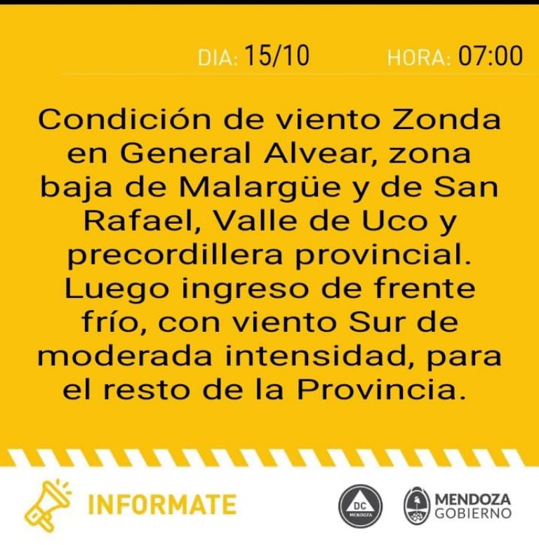 En la mañana de este miércoles, el departamento de Defensa Civil emitió una alerta amarilla por viento Zondaen General Alvear, zona baja de Malargüe y San Rafael, Valle de Uco y precordillera provincial.