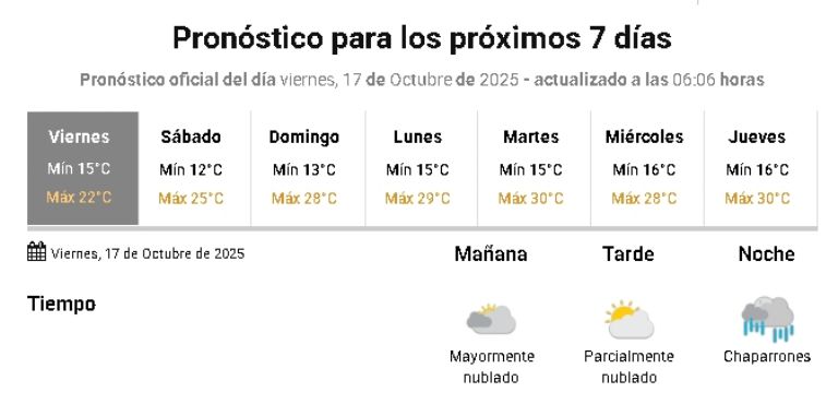 Este viernes será una jornada de transición hacia un fin de semana caluroso; no se descartan chaparrones aislados por la noche. La máxima será de 25°.