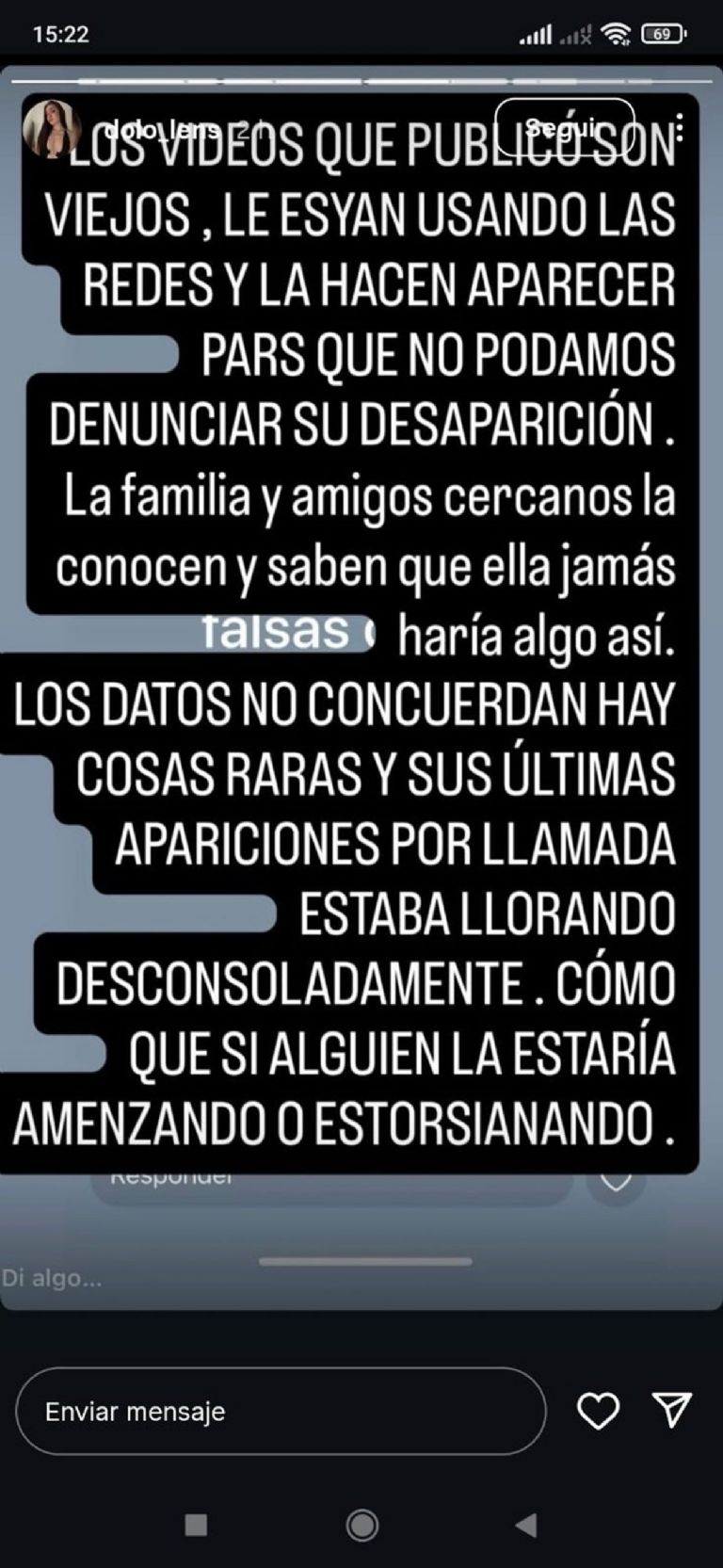 “Me contacté con una chica que la vio y me dijo que jamás le habló de un problema familiar, y aseguraron que respondía lo justo y necesario. Al tiempo empezó a interactuar más por mensaje y, cuando le dijeron de hacer videollamada, ella respondió que ‘más tarde’ o algo así”, enfatizó.