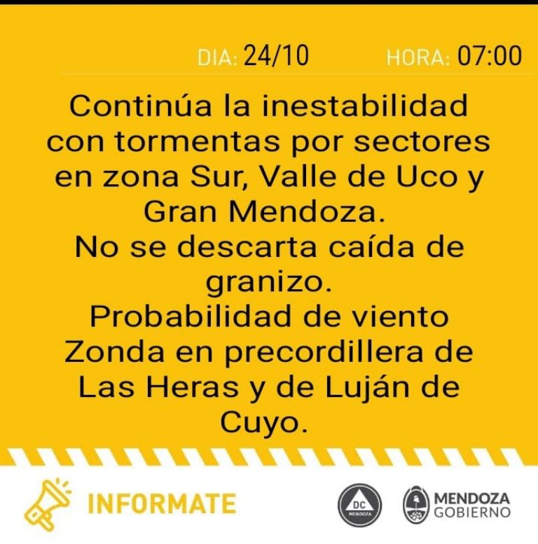 A esta situación se suma una alerta amarilla por viento Zonda emitida por el SMN. El fenómeno afectará puntualmente las áreas de precordillera de Las Heras y de Luján de Cuyo.