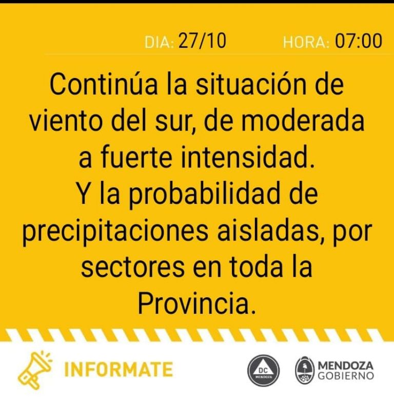 La principal advertencia para la jornada es la alerta amarilla por vientos emitida por el SMN para la zona noreste de Mendoza, que incluye departamentos como el Este de Las Heras, La Paz, Lavalle, San Martín y Santa Rosa. En estas áreas, se esperan vientos del sector sur o sudeste con velocidades que oscilarán entre los 40 y 50 kilómetros por hora, pero con ráfagas que podrían superar los 70 km/h durante la mañana y la tarde.