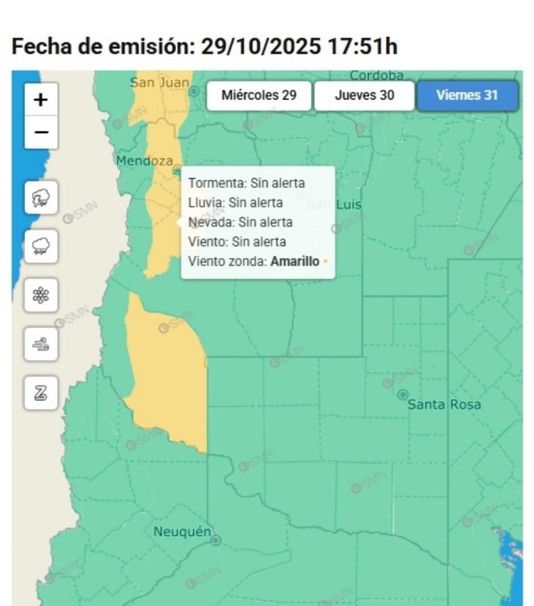 Para ese día el Servicio Meteorológico Nacional lanzó una alerta amarilla por viento Zonda en el sur de la provincia, Valle de Uco y el Noroeste provincial.