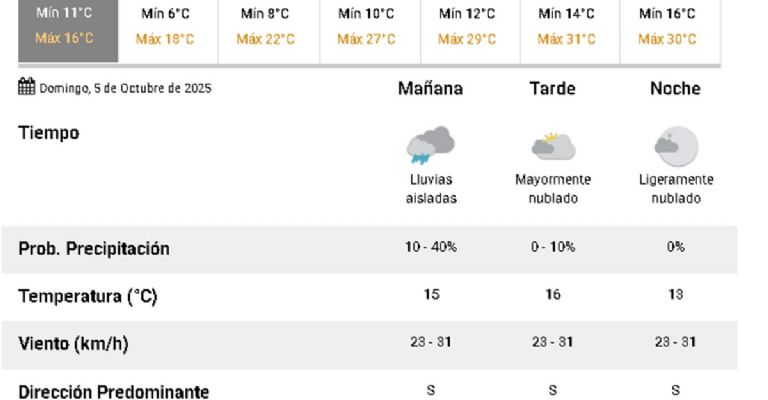 - Lunes, 6 de octubre: se espera un día soleado con una máxima de 19°C y una mínima de 10°C.