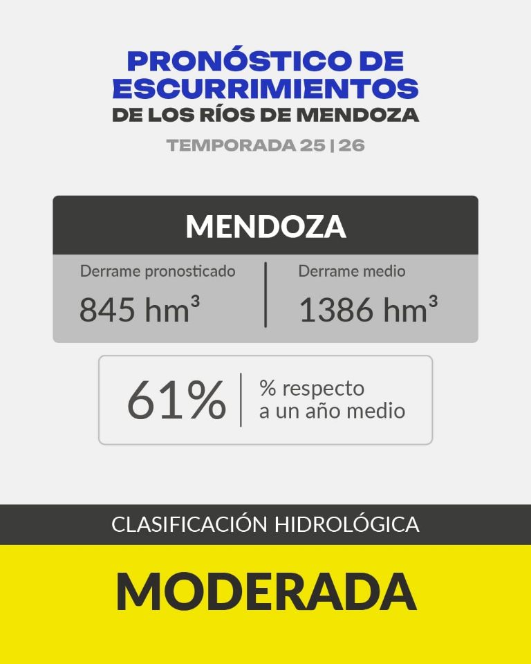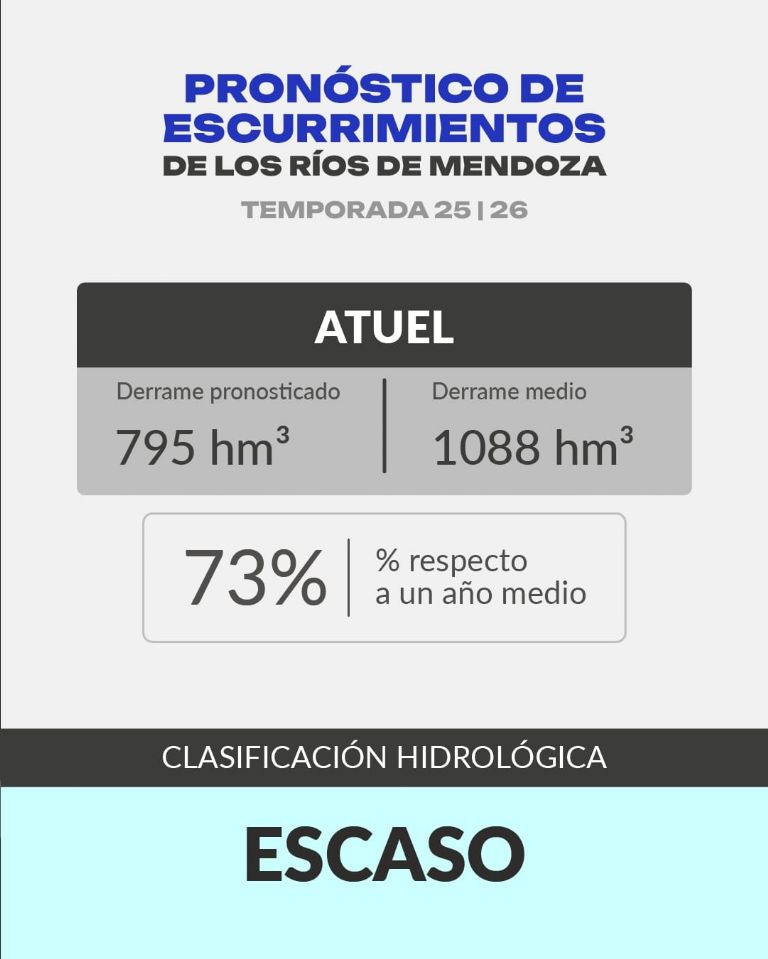 El año medio es 1.386 hm³ en ése río e Irrigación pronosticó para el Mendoza 845 hm³. De esos 845 hm3 hay que descontarle más de 250 hm3 para consumo de agua potable. “El volumen de agua que queda para la el resto de los usos indica que va a estar en un nivel de sequía hidrológica severa”, indicó Rubén Villodas, gerente de Gestión Hídrica de Irrigación. Los otros usos son riego agrícola, cinturón verdes, industrias, entre otros.