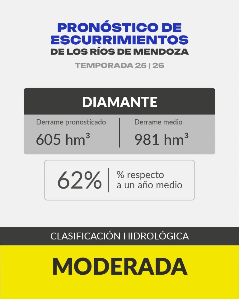 La estación meteorológica de Irrigación Laguna del Diamante indicó que se pasó de tener un 50% más de nieve el año pasado, a un 50% menos, lo que hizo que se calculen unos 605 hm3 para el río Diamante, esto es un 91% menos respecto al caudal promedio de 981 hm3.